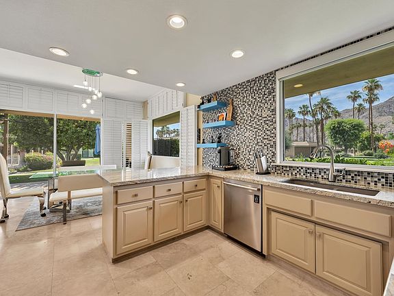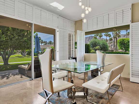Located in a charming enclave within the gates of historic Indian Wells Country Club. Enter this highly upgraded home with incredible views. Be impressed with high ceilings, light pouring in from the large windows and awesome south and west mountain views from kitchen, dining room and patio. All these qualities come together for an open feeling floorplan for entertaining plus good separation between master suites. All 3 bedrooms are ensuite with walk-in closets. The gorgeous gourmet kitchen has been updated with newer exquisite slab granite counters and mostly newer appliances. The home boasts plantation shutters and the design choices are very special with use of staggered Travertine flooring throughout, attractive subway tile backsplashes in kitchen and baths with raised stamped metal exterior sinks with porcelain interiors. Relax and entertain while you barbeque on your covered stamped concrete patio that runs the length of the unit. Take in the lovely views of lush greenery and manicured landscaping with pool behind plus wonderful private atrium patio to enjoy the outdoors. Double garage with an additional golf cart garage. Located near restaurants, entertainment, golf courses & shopping. Residents of prestigious Indian Wells benefit from discounted nearby golf, tennis and hotel restaurants or you may join Indian Wells Country Club, offering golf memberships, social activities, dining and fitness center and more. All this and you own the land!