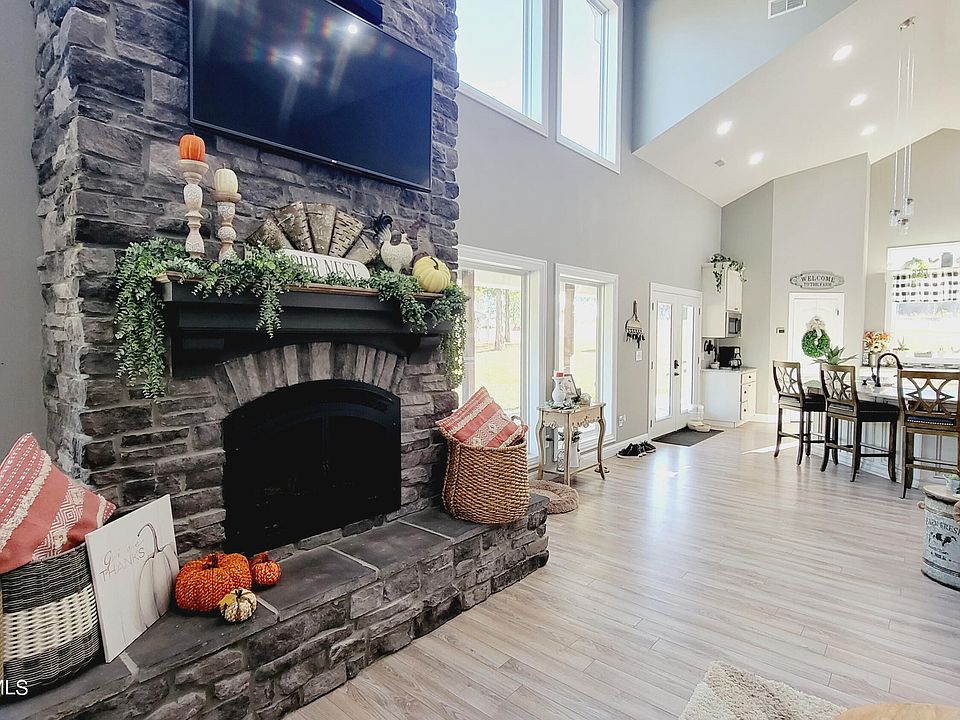 - Description: 26' ceilings with floor to ceiling stone fireplace