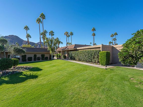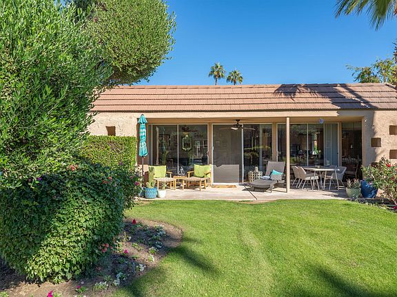 Mesmerizing scenic views of the surrounding south mountains and the lush area around the pool and lawn. Enjoy from your spacious covered patio or the comfort of your great room with high ceilings. Sliding doors offer unobstructed views from kitchen, dining and living room areas making for a convenient indoor/outdoor entertainment area. Gourmet kitchen with Bosch stainless appliances and granite counters with bar seating. Dual master suites both enjoy attached full bathrooms featuring new tile, double sink fixtures, toilets, tile floor throughout and walk in closets. plus access to a private courtyard. Laundry in separate room with waster/ dryer and ample storage space. Attached garage has space for 2 cars PLUS golf cart. BONUS - Roof was completely resurfaced 2 years ago. As a resident of Indian Wells you receive discounted golf at two championship courses and discounts at hotels, restaurants and spas.