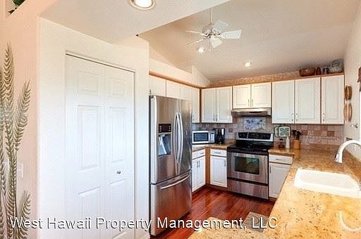 UNFURNISHED 3/2 PRIVATE HOME WITH OCEAN VIEW! AVAILABLE NOW! - Live near the Beach! Beautifully maintained single level home a few short blocks from White Sands Beach Park with nice ocean views and comfortable outdoor living area. This home has it all with Solar Voltaic System (Owned) , Solar Hot water, granite kitchen counters, quality stainless steel appliances, Brazilian Tigerwood flooring, vaulted ceilings, and much more. .. The beautiful gardens feature lush low maintenance landscaping (INCLUDED WITH RENT)You can often hear the sounds of surf while relaxing on your back yard patio. The extended custom patio is perfect for BBQs and entertaining with friends and family. The home is situated to capture Kona's balmy ocean breezes and has nice airflow. Alii Heights features sidewalks and street lights- Great for walks! Upgrades and Features include: * 16 panel photovoltaic System (owned) * 80 gallon Solar hot water system * Brazilian Tigerwood flooring in main living area. * Shutters in all bedroom windows * DeWils Cabinets * Extended custom-stamped concrete patio * Sunshades on lanai * Upgraded faucets * Custom shelving and drawers in master walk-in closet. And much, much more! A great place to call home in Kona! Central A/C system being installed. Pics will be shown once complete. Monthly Rent $3400.00 + 4.4386% GE Tax + Utilities (GE Tax will increase to 4.712% starting 1/01/2020). SOLAR SAVES YOU Water is included up to $100 per billing cycle HOUSE IS UNFURNISHED NO SMOKING ON PROPERTY - NO PETS Please ensure you can meet our application qualifications BEFORE APPLYING OR REQUESTING A SHOWING (see details below). No refunds given. West Hawaii Property Management, LLC 74-5565 Luhia St. STE 101 Kailua-Kona, HI 96740 Showings conducted Monday - Friday. No Pets Allowed (RLNE4622805)