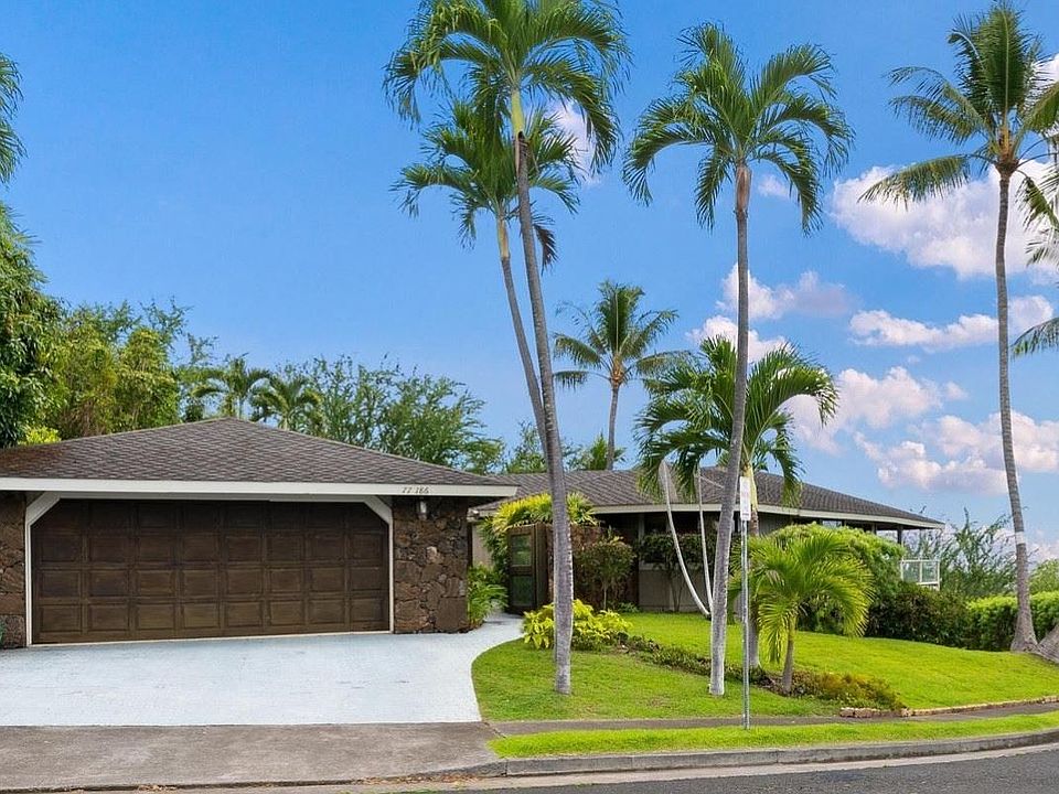 Fabulous large home in established and desireable neighborhood of Komohana Kai. This fully furnished home is located on a large lot in a cul-de-sac. From the security gate, through the fenced yard, walk into the open living room with its high open beam ceiling and be mesmerized by the large windows with the expansive ocean views. Walk right out onto the huge covered lanai and enjoy those amazing Hawaiian sunsets or enjoy your favorite cup of Kona coffee in the morning. The kitchen has tile counters and is open to the living room. Large pantry and laundry room off of the kitchen with ample storage. Decent sized bedrooms with high, open beam ceilings and the master bedroom has lots of windows to allow those clear sunrises. The master also has a door that leads out to the private tropical oasis with the sparkling pool, and BBQ area There is a downstairs, separate bedroom and bathroom with outside entry. Ideal for guests, extended family or your Ohana. Separate, oversized, 2 car garage with an extra storage area / could be used for workshop.