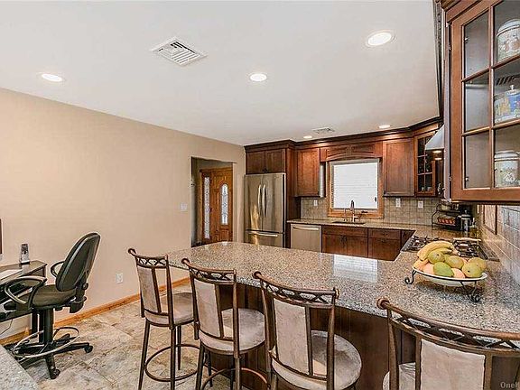 Major updates in 2013 include gourmet kitchen, SS appliances, radiant heat in kitchen, total roof replacement, 200 amp electric, and new HVAC with 2 zone CAC &Gas heat with on demand hot water. Gas cooking. Custom Kitchen cabinets & Quartz countertops, 6 burner Bertazoni stove. Vinyl siding, Cesspool replaced 2017. All CO's in place. Full finished basement, OSE and summer kitchen, full bath. Steps away from walking trails and over 600 acre park. Wood burning fireplace insert with stone surround and custom cabinets. Whole house generator, Alarm. Greenhouse and organically designed garden. Chicken coop. Quiet Dead End Street.