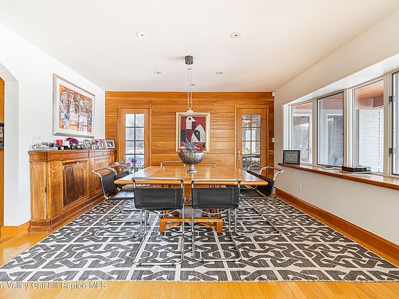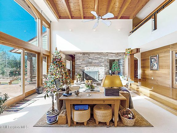 Designed by a renowned Manhattan architect known for 20M dollar Aspen ski homes, this 4,834-square-foot Catskills estate offers world-class design and unparalleled craftsmanship. Built as the architect's personal residence, it's a sanctuary for relaxation, entertaining, and year-round mountain living. Set on over four private acres bordering the protected Bataviakill Watershed, the home seamlessly integrates stunning Windham Mountain views with vaulted ceilings, floor-to-ceiling windows, and tiered decks. The property boasts five spacious bedrooms, three full baths, and a half bath, all thoughtfully designed to balance comfort and effortless entertaining. The sunken great room is a centerpiece, featuring a dramatic floor-to-ceiling wall of glass framing breathtaking mountain views. A striking stone fireplace adds warmth, while the formal dining area and chef's kitchen complete with custom cabinetry and stainless-steel appliances offer an ideal space for hosting. Additional highlights include a cherry-paneled office with bespoke built-ins, a glass-enclosed gym with panoramic views, and an indoor sauna for post-workout relaxation. The standout four-season circular porch, lined with windows and equipped with a wood stove, ensures uninterrupted connection to nature, making it the most enchanting space in the home. The first floor includes a guest suite, while the second floor features a private primary ensuite wing with a balcony overlooking Windham's slopes. The finished basement offers a family room and billiards lounge. Radiant in-floor heating, custom built-ins, cedar closets, and split-unit air conditioning enhance comfort and luxury. Outdoors, tiered decks, patios, lush landscaping, and a manicured yard create a serene setting, while a covered path leads to a three-bay garage perfect for vehicles and recreational gear. Tucked off a private road, this home offers true seclusion while being just minutes from Windham's town center and Windham Mountain activities. Combining stunning views, luxurious custom finishes, and unmatched craftsmanship, this estate stands apart from today's new constructions. Schedule a private viewing and experience mountain living redefined. Your perfect oasis awaits! A 3D Walkthrough Tour is available in the digital Lookbook or by request from the listing agent.