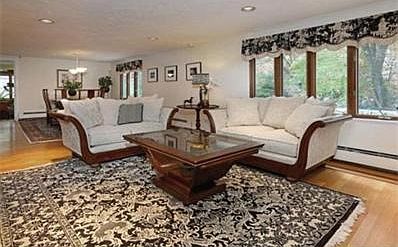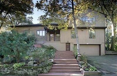 Sprawling mid century Contemporary Multi-level home in lovely private setting. There are ten rooms including four bed rooms (2 en suite master bedroom/bath) and a den/fifth bed room, three and one half bath rooms. Living room with fireplace that opens to the dining room, 21x17 family room with wood burning stove and glass doors leading to deck. Additional decks off kitchen and solarium. Large unfinished attic. Central A/C, Two car direct entry garage and large driveway. Close to Putterham shops, library and golf course.