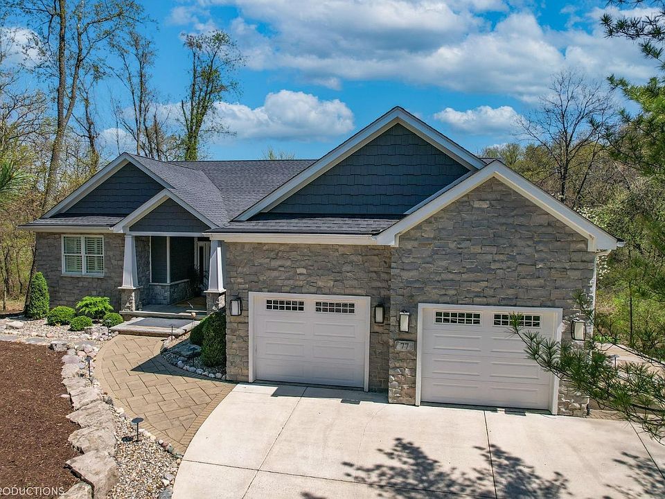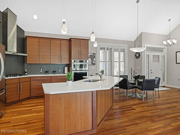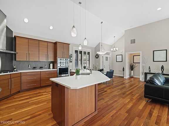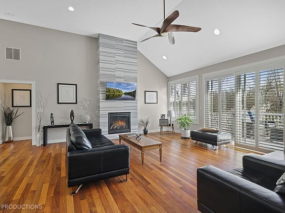 A stunning showpiece with extraordinary design, designer finishes, and setting on double lots. This home was designed for comfortable daily living and incredible entertaining. The Great Room boasts 13.5' ceilings, Cumaru Brazilian hardwood floors, floor to ceiling porcelain tiled fireplace, and a wall of windows & patio doors with Plantation Shutters overlooking the wooded view. The open concept kitchen has sleek, European cabinetry, Quartz counters, tiled backsplash, stainless appliances & range hood. The hardwood floors continue into Owner's Suite, which has a patio door to balcony, two generous walk-in closets, and a magnificent ensuite with dual sinks and walk through shower. A custom SS railing leads you to the walk-out lower level where you will find the Family Room with wet bar and sliding doors to the patio;, guest suite with full bath; two additional bedrooms; and 3/4 bath. The landscaping, adjoining woods and sounds of the birds provide you with your own private sanctuary.