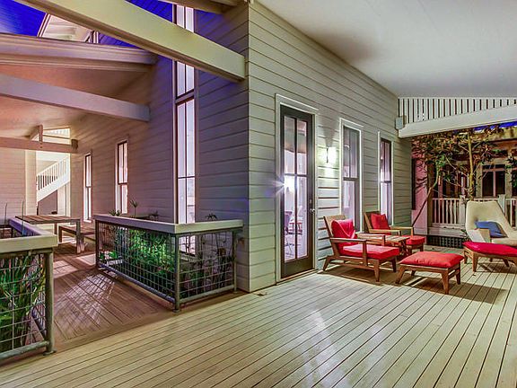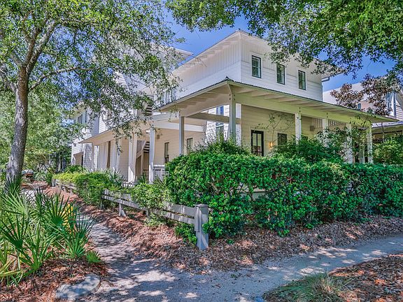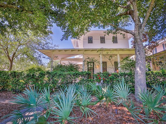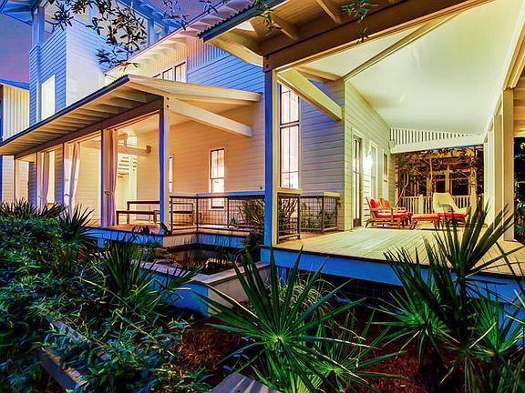Modern luxury in two distinct living spaces within easy reach of the beach & town center! A study in mid-century modern, 77 Buttercup is the very essence of less is more, as much art as it is architecture. Sleek and spare yet long on discerning detail, the delightfully unexpected Florida Haus design is a welcome departure from the typical WaterColor offering. Two distinct spaces, a voluminous two-story urban loft on the first level and the main house above, are joined by an external staircase that continues on to a 3rd-story tower. Front and side porches engage Crimson Park, and a coy little koi pond trickles gently below, where the two corners meet.This rare, timeless beauty, with its custom maple cabinetry and built-in platform beds throughout, is being offered for sale for
