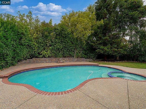 Single Story rancher in a double court location, with a pool. Positioned perfectly, on a thoughtfully and beautifully low maintenance, fully landscaped lot, with mature plants and trees, automatic sprinklers and drip system. This charming home is bursting with curb appeal and pride of ownership. Wonderful floorplan with separate living and family room areas, kitchen/family room combo with a formal dining area off of the entry. Formal living room features a cathedral ceiling and backyard access, in addition to views of the yard and pool. The yard is designed with a sprawling lawn area, free form pool/spa and gated side yard off of the garage The setting is peaceful, wooded and private. Other important features include: Convection microwave, new interior paint, updated bathrooms with stone tile floors and shower with dual shower heads, glass tile accents, as well as updated vanities with granite tops and more. The garage is an oversized two car garage with additional storage area and features a nicely finished, epoxy floor. The primary suite is situated at the back of the home and features a spacious sitting/exercise/office area. Part of top rated San Ramon Valley Unified School District and close to both Crow Canyon shopping and the Lot at City Center off of Bollinger Canyon Road.