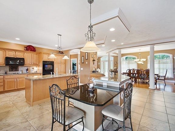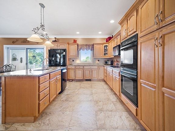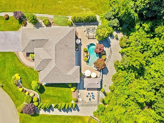 Builders own home offers Private setting, Views, and Spectacular open floor plan. Contemporary ranch designed for entertaining! 9' ceilings on the first floor and 10' ceilings in finished walk out basement. Massive kitchen with 2 large wall ovens, cooktop stove, sink in large center island, peninsula for buffet serving and built-in dining area open to large wet bar and dining room with oversized slider to covered patio. Living room has hardwood floors and surround sound. Master bedroom has his and her walk-in closets, tray ceiling and full bath with his/her vanities, shower and jet/soaking tub. Three additional bedrooms and first floor laundry area. Walkout basement has Theatre room with fireplace, fully applianced kitchen with dinette area, all open to large dining room/living room with slider to covered patio. Exercise room could be a bedroom. Music room is sound deafening. Heated inground infinity pool, bar area, firepit, and pagoda. In-law/ teen apartment. Whole house Generator.