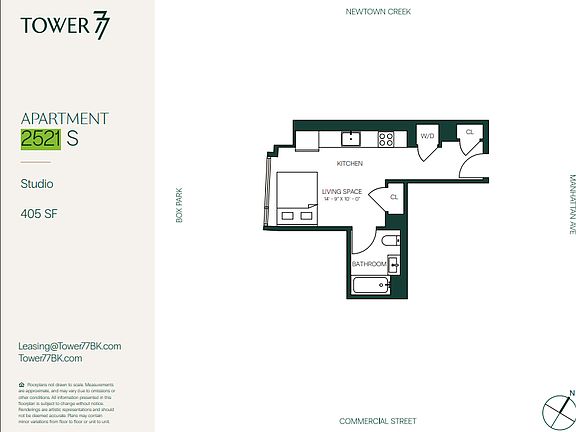 $0 Security Deposit due at signing! Open Houses weekly, I can show all buildings/units/listings (85, 77 and 87 Commercial). No broker fees/deposits by working with the building directly! Flexible move in dates! In-Unit Laundry, Central Air, Sunlit with Ample Closet Space both City and Water Views! Get them while they last! Welcome to Tower 77, where contemporary luxury meets the vibrant energy of Brooklyn's Greenpoint neighborhood. Nestled within the heart of one of Brooklyn's most sought-after locales, this iconic tower offers an unparalleled living experience. Boasting stunning architectural design and panoramic views of the Manhattan skyline and East River, Tower 77 stands as a beacon of modernity in the historic landscape of Greenpoint. With its sleek glass facade and meticulously crafted interiors, this residence sets a new standard for urban living. Step into a world of refined comfort as you enter Tower 77's thoughtfully designed apartments. Each residence features high-end finishes, expansive windows, and open-concept layouts, creating an inviting space flooded with natural light. There's a home to suit every lifestyle. Beyond the apartments, Tower 77 offers an array of amenities designed to enhance your daily life. Stay active in the state-of-the-art fitness center and yoga studios, or host gatherings in the stylish resident lounge childrens playroom, media room, co working space, or recreational area. We also boast one of the best, state of the art sauna and pool areas with spectacular terrace access to breathtaking water and city views. Conveniently located just moments away from the vibrant dining, shopping, and entertainment options of Greenpoint, Tower 77 provides residents with easy access to everything this dynamic neighborhood has to offer. With nearby transportation options including the G train and East River Ferry, Manhattan is just a short commute away.
