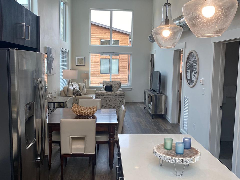 Brand new Townhouse-Fully furnished turnkey ready to move in, high speed internet, cable, electric, water & trash included clubhouse with workout gym, outdoor Jacuzzi's, attached oversize 2 car heated garage, great views of mountains from the front balcony, biking and hiking trails along the river just outside the front door, new appliances, wood floors & carpet in the bedrooms & 20-foot loft style ceilings Owner pays for all utilities, no smoking or vaping, guest parking available