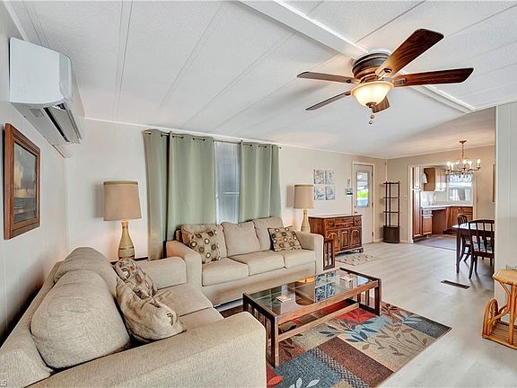 Enchanting Acres Mobile Home Park—an inviting 55+ community at 77 Enchanting Blvd. This spacious double-wide mobile home offers approximately 1,064 square feet of living space and features 2 bedrooms and 2 bathrooms. The front-facing kitchen is well-equipped with a dishwasher, microwave, electric range, and French door refrigerator, making it perfect for everyday meals or entertaining. Enjoy the Florida room with northeast exposure, ideal for relaxing or taking in the fresh air. The home also includes a convenient laundry closet off the second bedroom, newer vinyl flooring in the living room, and a newer mini-split AC for added comfort. Mobile was repiped and new water heater installed. As a resident of Enchanting Acres, you'll enjoy an active lifestyle with community amenities including a pool, shuffleboard, a clubhouse with a resident kitchen, a billiards room, and a library. Water, sewer, trash, lawn care, and the use of these amenities are included in the low monthly fees. Located in a prime spot, this home is just minutes from Sugden Park, Naples beaches, and Downtown Naples. The vibrant Bayshore Art’s District and various shopping, dining, and entertainment options—like Publix and a movie theater—are conveniently across the street. This home is perfect for a seasonal getaway, full-time residence, or a second home. Note: Pets are not allowed, and ownership is Co-Op.