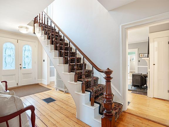 An icon on Cumberland Foreside, loved by the same family for six generations, being offered to the market for the first time. 77 Foreside Road exudes a sense of place not found in many parts of the world today. The home is sited on a rise overlooking rolling fields tumbling towards the shores of Broad Cove. The nearly 2.5 acre site includes ancient stone walls, specimen trees, a circular front driveway, glorious sun exposure, and views of Casco Bay along with deeded water rights and beach access! The classic Farmhouse has been lovingly maintained to retain many period features, with modern updates including all new true divided light windows, a stylish and highly functional kitchen recently remodeled by MR Brewer, and updated bathrooms. Inside, the warmth of the centrally located woodstove greets you. The floorplan allows for both casual and formal spaces, with flexibility for the needs of modern living. The rear living room with a large picture window, pellet stove, and back porch is as inviting a room as you will find. Through to the dining room you will find stunning floors of American Chestnut, sourced directly from the property. From there, the kitchen and butler's pantry steal the show, with modern amenities and high end finishes integrated with the traditional kitchen design. Adjoining the home via breezeway is a charming carriage house with a full foundation, great for vehicle storage and dried firewood. Back inside, a front and back staircase lead to the 4 bedroom 2 full bath upstairs layout, with a walk-up attic offering additional opportunities or storage. With spacious rooms and an exceptionally pleasant feel, this home invites you to day dream of times-gone-by while enabling full immersion in the modern world. An ideal location only minutes to Cumberland Center, the conveniences of Falmouth and Yarmouth, and the services, culture, and culinary delights of Portland, this property allows you to enjoy the very best of Coastal Maine.