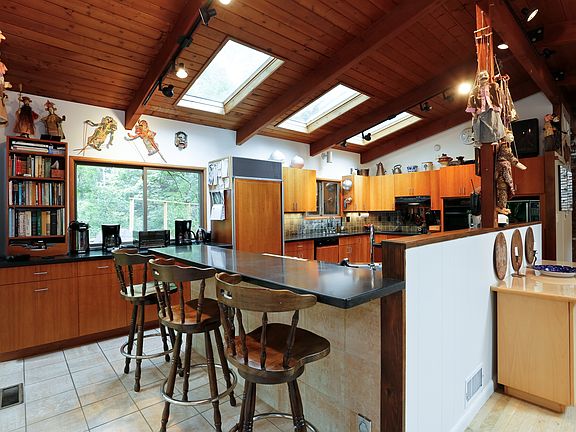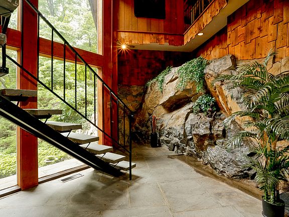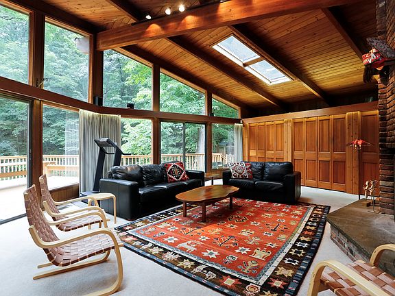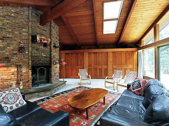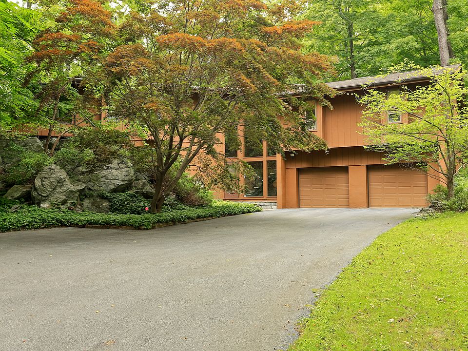 Mid-century modern contemporary home. Gated entrance-Secluded setting, surround by large estate properties. 2 Story entry with Stone Wall/Waterfall. Great Room has incredible light with floor to ceiling doors/windows with Double Skylights- Floor to ceiling Brick fireplace. Wrap Around Deck- Open and Bright Gourmet Kitchen with Sub-Zero Refrigerator, 2 separate cooktops/double oven and 2 separate sinks, allowing for multiple chefs at one time. Master Bedroom Suite w/jacuzzi