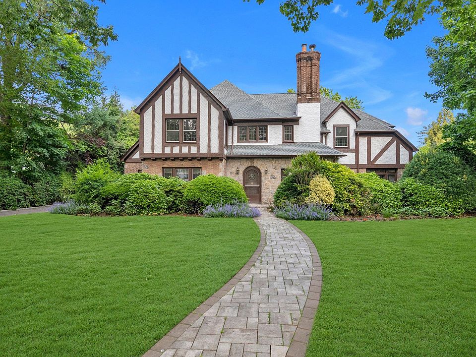 Presenting 77 Hampton Road, an architectural masterpiece by renowned architect Olive Tjaden and designed with the utmost attention to detail. This exquisite tudor with over 4,200 interior square feet features 6 bedrooms and 4.5 baths. The expansive layout is adorned with custom moldings, intricate built-ins, grand arched doorways, soaring beamed ceilings and elegant European fixtures. Stepping into the grand entryway, the striking spiral staircase certainly sets the tone for the exceptional craftsmanship found throughout. The first floor features a spacious living room with wood-burning fireplace, formal dining room, gourmet eat-in kitchen with large center island and separate breakfast room, a study and a powder room. The upstairs has a large primary bedroom with en-suite bathroom with double sinks and vanity area, 3 additional bedrooms and 2 full baths with separate guest quarters with 2 private bedrooms and full bath. Some highlights of the home include central air conditioning, gas heating, gas cooking, hardwood floors, a large unfinished attic, in-ground sprinkler system and a 2-car attached garage. The beautifully appointed private backyard on park-like property with lush landscaping and rear blue stone patio makes it perfect for entertaining. The house is located in close proximity to restaurants, shopping, downtown 7th Street, Garden City Country Club and the Long Island Railroad. This is a rare opportunity to own a truly remarkable home in the Estates section of Garden City.