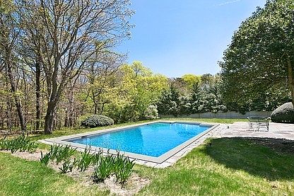 Set back from a quiet road this home abuts over 10 acres of reserve land on two sides providing invaluable privacy to the back yard and delightful stone patio and pool. Across the road find another 8 acres of reserve land. There is a wood burning fireplace central AC and a two car garage all on .82 of an acre. The updated kitchen and baths are neat and immaculate. Since there are plenty of larger homes here, feel free to renovate and/or expand. Minutes to beaches and the Village.