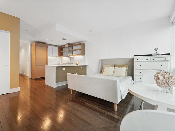 Apartment #2713 stands out as one of the largest and most sought-after studio apartments in Downtown Jersey City's prestigious 77 Hudson, known for its exceptional maintenance and rarity on the market. It boasts the distinction of being the highest-floor studio in both the building and the surrounding area. This home is bathed in sunlight, offering stunning views of the Hudson Bay, Liberty State Park, and Paulus Hook Marina, all visible from its advantageous South West facing position. The apartment features 77 Hudson's signature curtain glass walls, which provide uninterrupted views and fill the space with natural light. The interior boasts a modern European kitchen equipped with Italian Dada cabinets, elegant white quartz countertops, and a luxurious marble bathroom, evoking a spa-like ambiance. It is an ideal space for those working remotely, offering plenty of room for a home office setup. The suite of high-end appliances includes a Miele dishwasher, Liebherr refrigerator, Bosch washer/dryer, Siemens oven, and a Sharp microwave. Recent upgrades enhance the apartment's appeal, including polished hardwood floors (2019), an Ikea PAX wardrobe system, Container Store Elfa closet organizers, and extra wall-mounted cabinets for additional storage. The building offers an impressive 44,000 square feet of resort-like amenities, including a fitness center, swimming pool, jacuzzi, virtual golf, open bbq grills, screening room, conference/business center, dog run, pet grooming room, and spaces dedicated to yoga and pilates, along with steam rooms, saunas, and massage facilities. Its prime location in Exchange Place ensures a swift commute to NYC, with convenient access to the PATH, ferry, and Light Rail services right outside your door. Spectacular waterfront views to Manhattan for your strolls or run. Plus, Whole Foods is just moments away. Viewings are available by appointment only. In accordance with building regulations, a confirmed showing on the ShowingTime app is required. One deeded garage parking (A71, on the 3rd FL, across the elevator) can be purchased at $45,000. It is currently rented month to month at $200/m.