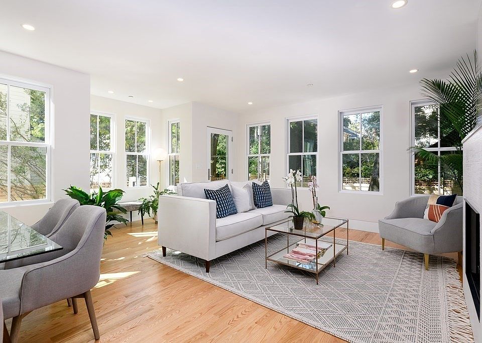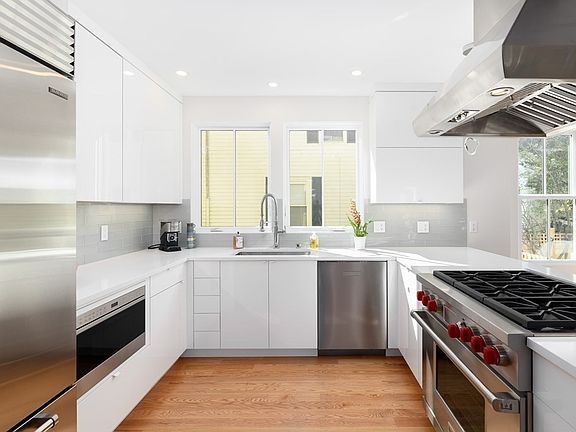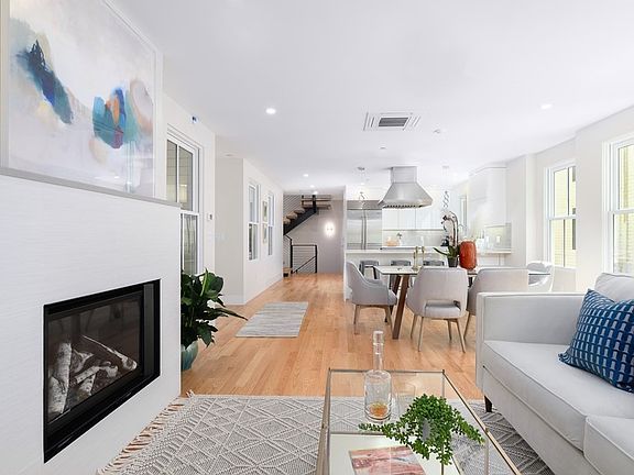 Light and bright are the guiding principles of 77 Inman Street. The sleek all-white kitchen boasts quartz countertops, a Sub-Zero refrigerator, a Wolf six-burner gas range, an ASKO dishwasher, Appleton cabinetry, and a peninsula with room for stool seating. A floor-to-ceiling stone gas fireplace offers separation between the open-concept dining and living rooms. Head up the floating oak staircase with an open metal railing to the second floor which hosts two bedrooms and two bathrooms. The primary bedroom is a spacious retreat with a walk-in closet and an ensuite bath outfitted with a soaking tub, a stone shower, and dual sinks. The third bedroom and bath take up the entire third level. The garden level hosts the fourth bedroom, the fourth full bath, a media room, and a laundry closet. The home has a private bluestone patio and an off-street parking spot. 77 Inman is located just outside of vibrant Inman Square and a short distance from Harvard and Central Squares.