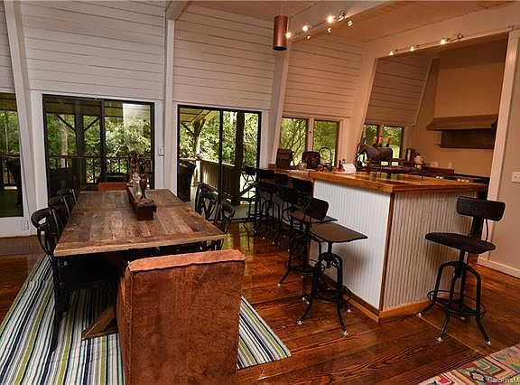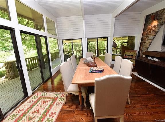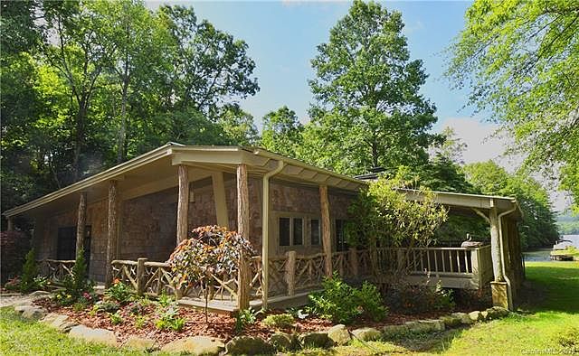 Unique Mountain Contemporary Home on a very private 3.32 acres (the largest available lot on the lake). This newly renovated 4 bedroom, 2 bath home, has beautiful wide planked pine floors throughout, tongue and groove vaulted ceiling, and a massive tapered native stone fireplace. A huge covered side porch offers an incredible amount of outdoor living space with sensational lake views looking straight up the cove. A series of ponds and trails along with a tree fort overlook give this property a park like feel.This mid-century modern mountain home was renovated in 2019 to match some of the local mountain history with locus post and popular bark siding. Located inside the world class resort of Lake Toxaway North Carolina also called the little Switzerland of America historically and by others the Yellow Stone of the East Coast. Set in a beautiful location, the views were maximized throughout the interior through expansive windows.