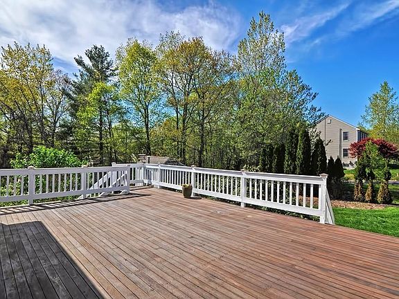 This custom crafted home is filled with natural light, and was designed with a European flair. Located in one of Holliston's most popular neighborhoods, this home sits on a lovely level lot with beautiful flower gardens and a gorgeous backyard. Kitchen features brand new stainless appliances, granite countertops and custom red birch cabinetry; dramatic family room with wood beamed ceiling, french doors to oversized mahogany deck, Vermont Casting fireplace & open staircase to lower level; large dining room with hardwood floors, pillars & new lighting fixture; 1st floor office; mudroom with custom cabinetry. Upstairs you'll find the welcoming master bedroom with solid cherry flooring, custom closet system and a stunning spa-like bath; another large bedroom with hardwood flooring & walk-in closet, plus 2 additional generously sized bedrooms. Finished walkout lower level offers a multitude of possibilities, with access to a beautiful brick patio. Excellent Holliston school system too!