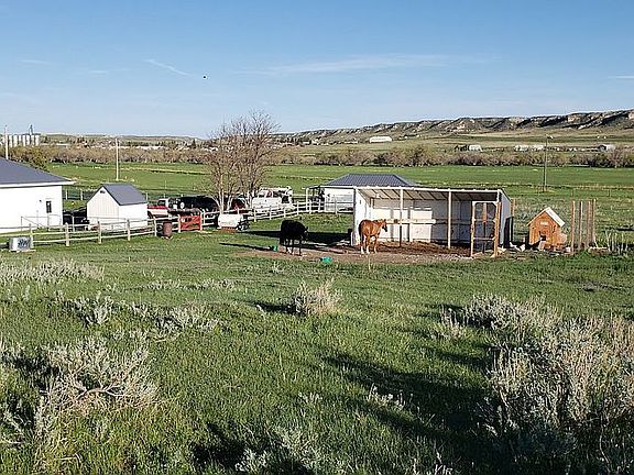 Nestled on 44 acres just one mile from Chugwater, this warm and inviting home awaits a family that enjoys the beauty of the great outdoors with plenty of room to stretch out inside. Hardwood floors throughout exception of bathrooms an laundry room. The main living area includes an open living and dining area complete with a gas fireplace and pellet stove that will heat the whole house. The kitchen is equipped with a center island, enclosed pantry, breakfast nook and plenty of cupboards. The master bathroom includes a jetted tub, and separate bathroom and shower. The master bedroom has an attached sunroom that attaches to a covered porch that spans the length of the front of the home. Three additional large bedrooms are located on the other side of the home. There are two forced air furnaces and a large attic with flooring for adequate storage. The views from the front porch are of the Chugwater valley and bluffs and the fenced back yard backs up to rolling hills. The attached two car garage includes six built in storage closets. Metal roof and siding on home and bunk house. There is a separate heated bunk house, tool shed, chicken coop, and pole barn. Home has a private well with a new well pump, septic tank, privately owned propane tank and the asphalt driveway was resealed last summer. The property is fully fenced and bounded on two sides by state land.