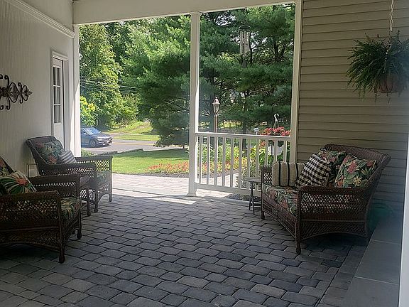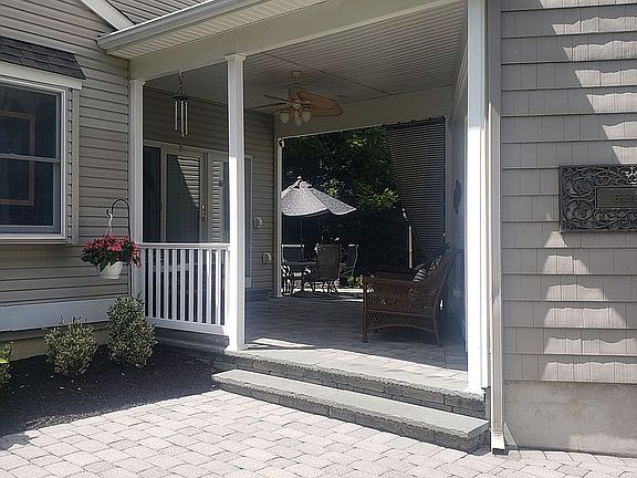 First Floor has 4" wide oak flooring. Includes designer eat-in-kitchen stainless appliances, granite tops & stainless pot-filler. In addition to the custom maple kitchen cabinets, there are two 8' matching cabinets with drawers and shelves on either side of the windows for storage. House includes living room, dining room, 25 ft family room w gas fireplace and built in shelves, laundry area and powder room. 2nd floor, carpeted, has Master BR w full bath, Guest bedroom, and full bath w American Standard whirlpool tub. Also a 12x14 Loft/Office and plenty of closets including 1 walk-in. 210 sq ft Covered Breezeway with Belgium Block pavers connecting FR and Garage. Breezeway overlooks 500 sq ft custom designed Belgium Block paver patio overlooking the private wooded rear yard & the Hop Brook Tributary.