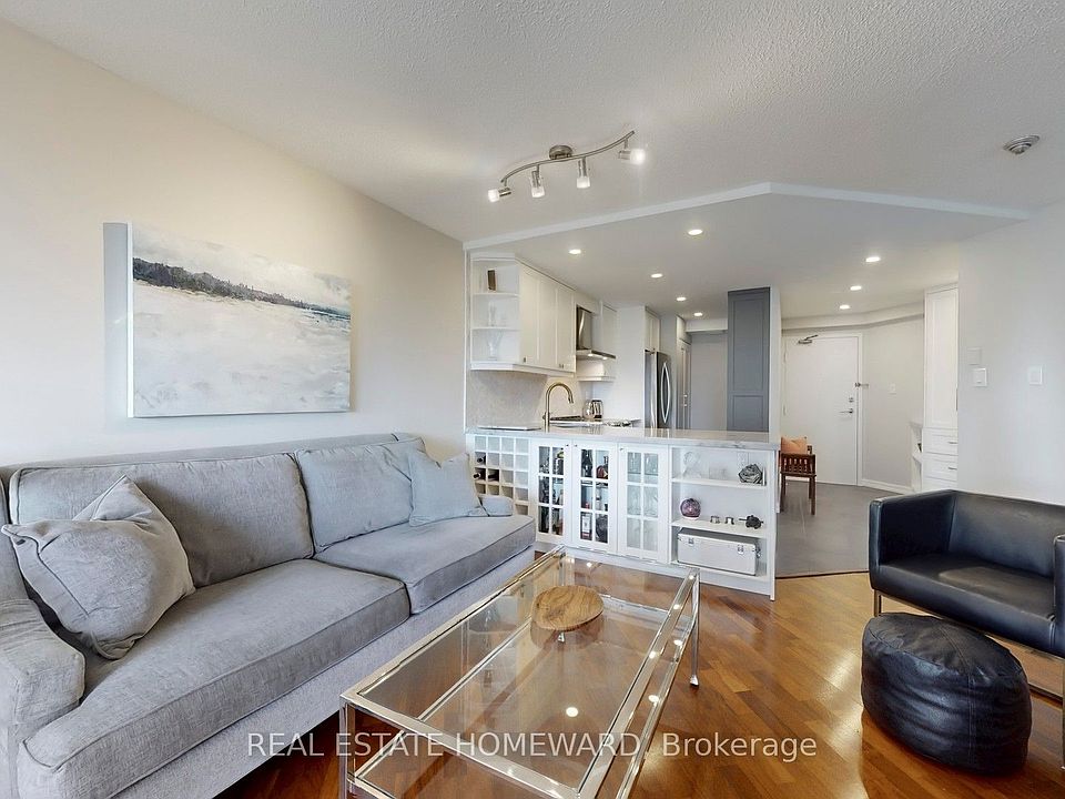 Welcome to Celebrity Place condominiums located at 77 Maitland Place. This is likely the finest unit to be offered in this sought-after building in recent years. Lovingly renovated over time by the current owner with exceptional taste and attention to detail. This is the largest layout in the towers at 876 sq. ft., also featuring the largest southeast-facing balcony with a preferred courtyard view - a quiet, sunlit retreat for morning coffee and shaded relaxation in the afternoon. The foyer features custom full-height cabinetry and slate-toned tile leading into a fully redesigned dream kitchen with matching custom cabinetry, a double-depth peninsula with wine storage and bar display, and natural quartzite slab counters throughout. The primary bedroom includes full-height wardrobe cabinetry with cupboards and drawers - no dresser needed - plus custom-fitted closets in both bedrooms. The ensuite boasts a quartz vanity and honed marble mosaic tile; the main bath features a marble-tiled walk-in shower and marble vanity. Both bedrooms enjoy large picture windows capturing the morning sun. A rare opportunity in a high-demand building - just move in, unwind, and enjoy.