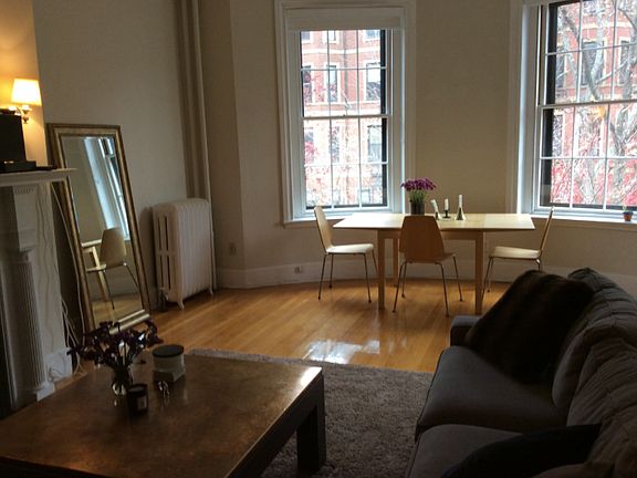 NO FEE On the very desirable second block of Marlborough St, just 1.5 block from the Public Garden Beautiful , well-maintained apartment occupying the entire second floor of elegant brick townhouse Lovely period detail, incredible natural light and eleven foot ceilings 1000 sq feet Large bow-front living room with decorative fireplace One very large bedroom with decorative fireplace, and one smaller bedroom - both with large closets Kitchen recently remodeled with granite counters and stainless steel appliances. Newish, attractive, spacious bathroom Hardwood floors throughout Laundry in the unit Gorgeous garden for use by all residents Heat included in the rent Brand new furniture as seen in photos available to buy. Absolutely everything you need! Please note, this is a non-smoking house Hurry, available early DEC, 2016 Tenant only responsible for electricity, heating provided. Pets upon approval.