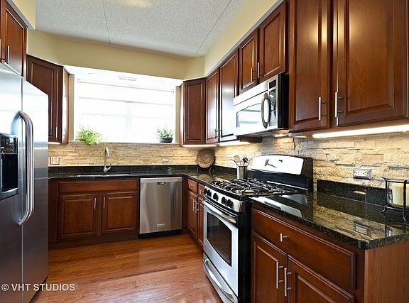 This GORGEOUS home shows like a model! Home is a corner unit featuring bright sunny windows w/stunning views of the park! Gleaming hardwood floors throughout living rm, dining rm, kitchen, den and hallway. Enjoy the gourmet kitchen which offers stainless steel appliances, 42" cherry cabinets, granite counters, and stone back splash. Charming den or media room w/French doors. Open layout w/living room adjacent to dining room and balcony. Every room has been freshly painted in light bright neutrals. Brand new luxurious carpet in both bedrooms, marble counters in both bathrooms, new faucets, new light fixtures throughout. Relax in your master suite w/gorgeous arched window to take in the park views. Enjoy the spa-like bath w/marble counters, whirlpool tub, separate shower, dual sinks, and plenty of storage. Nothing to do but move in and enjoy! Secure building w/work out room, additional storage space, garage space included. Easy walk to the train, beautiful downtown, and restaurants!