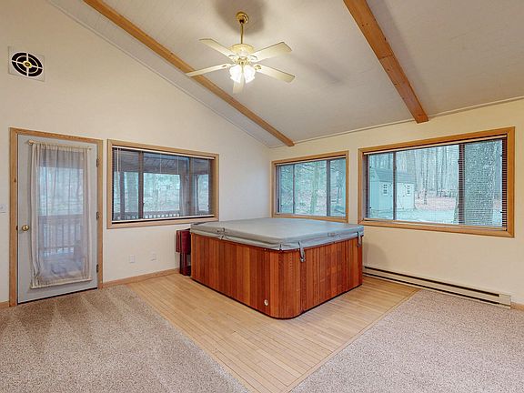 Welcome to this Charming 4-bedroom, 2-bathroom chalet-style home nestled in the amenity-filled, gated community of The Hideout. With soaring cathedral ceilings in the living room, kitchen, and dining area, this home offers a spacious and airy feel, enhanced by abundant natural light and a skylight in the living room.Enjoy cozy evenings by the fireplace in the dining room or relax in the screened-in gazebo on the deck--perfect for entertaining or quiet mornings with a cup of coffee. The home features modern stainless steel appliances, a newer roof with new gutters, and a soothing hot tub for year-round enjoyment.Thoughtful design includes plenty of closet space, making it ideal for full-time living or a weekend escape. Whether you're hosting guests or enjoying family time, there's ample room for everyone.Don't miss the opportunity to own this inviting mountain retreat in one of the Poconos' most desirable communities.