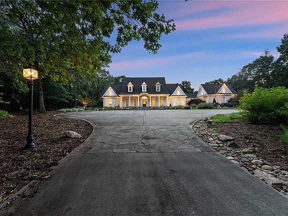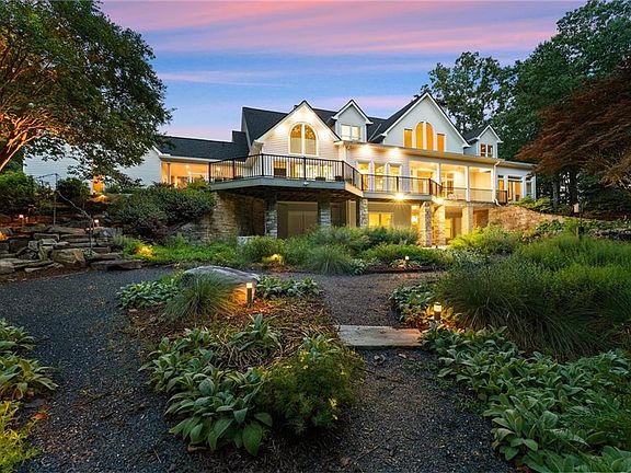 Perched on over 14 stunning acres, this breathtaking estate blends timeless elegance with unmatched tranquility in the heart of Dahlonega. Welcome to 77 Old River Road—a refined mountain retreat offering stunning views, total privacy, and a lifestyle of peace and sophistication. As you arrive, the stately driveway winds through professionally designed landscaping and leads to a grand Southern-style residence that captures the essence of North Georgia mountain living. Inside, the main level unfolds with warmth and elegance—featuring an open-concept layout, hardwood floors, soaring ceilings, and designer lighting. The expansive primary wing on the main floor includes a private fireplace, a newly updated spa-like bathroom, and access to a private deck with postcard-worthy views of the backyard oasis. A secondary ensuite bedroom, formal library/office, welcoming living room with fireplace, and gourmet kitchen with a breakfast nook and keeping room provide space for both relaxing and entertaining. Step out to the screened porch or enjoy the tranquil koi pond below—this is serenity redefined. Upstairs, discover a second luxurious primary suite, with custom cabinetry, additional guest bedrooms with flexible space for hobbies or work, and a cozy bonus room that could function as another office, or movie theater. Downstairs, the fully finished terrace level is an entertainer’s dream, second family room, bonus space perfect for a theater, gym, or game room, and walk-out access to the outdoors. Outdoors, custom-crafted railings line peaceful walking paths, and multiple porches and decks invite gatherings under the stars. The estate includes ample parking with the three car garage and no HOA restrictions—offering freedom and comfort, just minutes from Downtown Dahlonega. Recently renovated with high-end finishes and featuring dual primary suites, this rare gem is perfect for those seeking luxury, privacy, and the magic of mountain living.