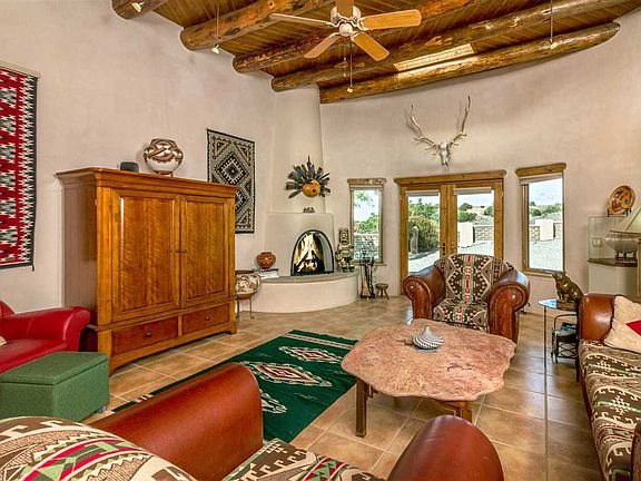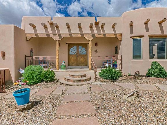Located in the tranquil subdivision of Las Lagunitas, amid the valleys and foothills of La Cinega, lies this striking custom adobe home, created especially for this one owner home. An atmosphere of exceptional and inviting living, with reclaimed vigas through out, superb craftsmanship exhibiting, hand crafted cabinets and doors, distinctive wood details, a grand double door entry, separated bedrooms, huge primary closet, separate shower and jetted tub, tank less hot water heater, breakfast nook, alluring smooth plaster, art and pottery walls and huge dramatic adobe wall encircling the home, providing wonderful privacy and contiguous to large dedicated open space and stunning stone work by Raul,this home feels like brand new.