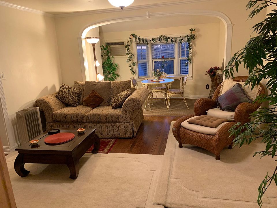 Beautiful fully furnished very spacious 1 BR apt. - living room, dining room, eat in kitchen, lots of storage, walk-in closet. Month to month lease OK. Includes: Wireless internet Heat and hot water and AC unit. Fully stocked kitchen, sheets and towels. Parking pass for street parking. Use of washer and dryer available at certain times. Apt. is on second floor of beautiful two family home in quiet neighborhood. Close to public transportation. 20 mins to NYC.