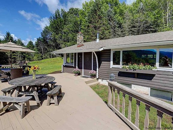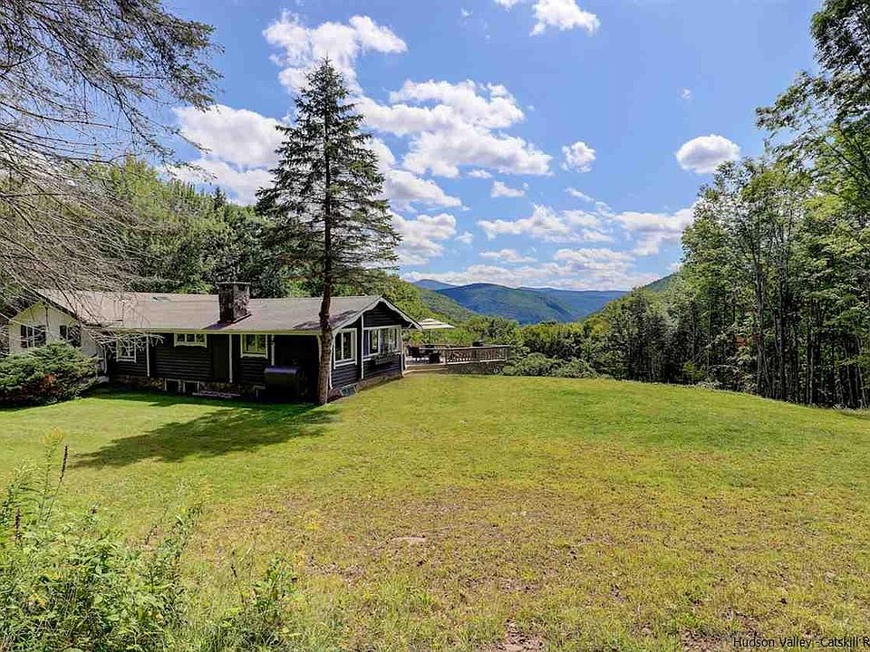 Privacy high in the Catskills with magnificent views and close proximity to skiing at Belleayre, Hunter & Windham. This original, family log cabin (c. 1957) was expanded, creating a 5-bedroom, 3-bath home on 2.47 acres that has AMAZING VIEWS. Enter cute log foyer into a vaulted and beamed, eat-in kitchen with a wood-burning stove. View the upstairs first - before you take the steps down to more living space! The kitchen includes a charming sitting area with windows and views of the lawn, trees and mountains. Easy access to a marvelous deck makes BBQing a snap. The living room is also vaulted and is anchored by a hand-built, river-stone fireplace. Sit apres ski and enjoy the expansive winter view. Three bedrooms on this level include a master suite with a private deck and view. Two more ample bedrooms share a Jack-and-Jill bath. Downstairs there's an additional bedroom and an adorable bedroom nook, making this house a place that will accommodate ALL your friends and family. Downstairs also has a large family room with another stone fireplace and a full bath. The property surrounding the deck and house gives you room to play soccer or bocce or to run and play--while enjoying the Catskill Mountain backdrop... or make a garden or meditation spot in the woods. It's a place to unwind and call your home! Access from the driveway and downstairs garage leaves you in another foyer/mud room, a great place to leave skis in winter or gardening clothes in summer. This house is a slam-dunk, a pleasure to see and show.