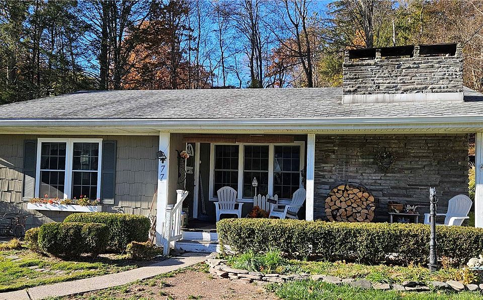 Relax on the covered front porch as you watch the seasons change, then step inside to an inviting oak-floored living and dining area featuring a bluestone hearth and glass-fronted woodstove—both cozy and practical. The well-appointed kitchen, with solid-surface countertops and abundant solid wood cabinetry, includes updated appliances and opens to a bright family room overlooking the backyard’s stone walls and patio with a propane firepit—perfect for entertaining or quiet evenings.