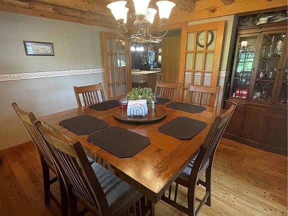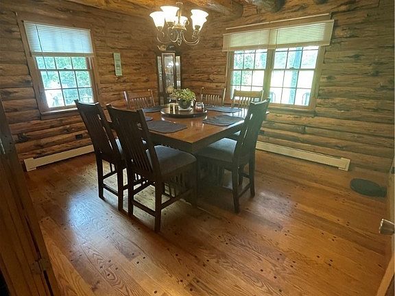 Welcome to this charming 3 Bedroom 2 1/2 Bath log cabin on 5.58 acres. Entertain with ease in your country cabin eat-in kitchen that leads to the dining room, living room with beautiful brick fireplace, and back screened in porch, patio, and deck. This property features a partially finished basement, 2 1/2 car garage with loft storage, and a large manicured lawn with an above ground pool. There are trails throughout the back of the property. Location is close to the Salmon River and Lake Ontario.