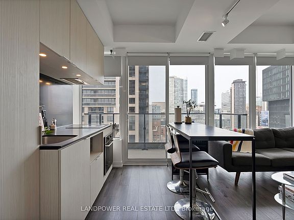 Seize the opportunity with this attractive bright 1BR located on the 25th floor. Great for starter home and investors alike. Low maint fees. Walking distance from Toronto Metropolitan University,Ryerson, and Eaton Centre. Functional layout with open living/dining. Sleek built-in appliances fora modern aesthetic, equipped with a kitchen island, ensuite laundry, and roller blinds. New grocery store located at the base of the building. Great amenities: common workspace area, gym, party room,and rooftop pool. Enjoy the west views over the city from your private balcony.