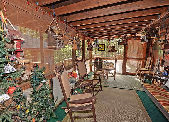 A pretty wooded 1.76 ac setting with circular drive and 2 BR 2 BA with incredible amount of living space! The kitchen has large island with storage and opens to dining area and one living space with a WB stove surrounded by stone. Vaulted ceilings in kitchen, dining and living areas. Off of dining is a second large all wood living area with gas stove. Owner BR has sliding doors out to the deck. Beautiful wood cornices over each window, all wood doors and trim contrast beautifully with drywall areas. Wonderful outdoor space with deck, detached screened porch with hot tub, plus a second screened porch attached to the home. Plus detached 2 car garage.