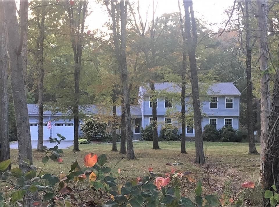 Warm and welcoming Wickford 4 bed colonial is set serenely back from the road on 9+ private acres. Spacious family room with designer fireplace mantle incorporates a pellet stove. A mudroom and laundry room leads to the 2-car garage. The family room is open to the updated kitchen which has granite countertops and stainless appliances. A formal dining room and large living room complete a comfortable flow of 1st floor rooms. On the 2nd level are 4 bedrooms and a full bath. Hardwood flooring throughout the main rooms with cork vinyl in the kitchen for comfort underfoot. Outside, a spacious deck overlooks the fenced backyard. An additional deck at ground level adds to outdoor enjoyment in this very private, serene woodsy landscape. Maintained with care, the home has recent window, roof and septic updates. Such a lovely oasis central to every Village amenity. Visit soon. Subject to Sellers finding suitable housing.
