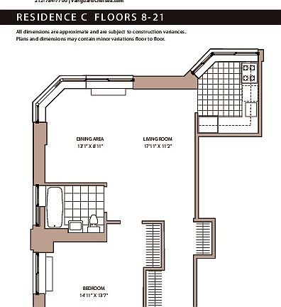 The 31-story Vanguard Chelsea features a limestone and bronze entrance to a sophisticated contemporary lobby with geometric pattern limestone floor, layered Venetian plaster, mahogany and cast stone concierge console and bronze accents. Building features include: Sophisticated, contemporary lobby with geometric pattern limestone floor, mahogany columns and limestone concierge console 24-hour concierge Residents-only fully equipped fitness center and aerobics room 4,000 sq. ft. landscaped terrace Conference room Hi-speed Internet and telephone access (three providers) Cable TV WiFi Telephonic intercom system/multiple phone lines per residence Bicycle room and individual resident storage 24-hour parking garage with valet attendant Maid and valet services Unsurpassed level of service * Listed rent is net effective rent, based on a gross rent of $4271.00 and 2 Months Free