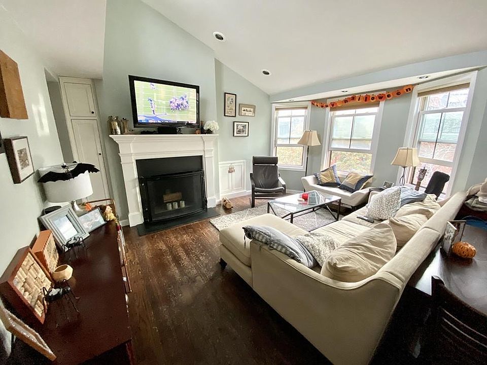 Sun drenched PH condo ideally situated on a tree-lined street in South End's desirable 8 Streets Neighborhood. Two spacious bedrooms with generous closet space. Open concept living/dining room boasts hardwood floors, vaulted ceiling, recessed lighting, custom cabinetry, and a fireplace. Large rear deck, accessible from both bedrooms; full stair case leads to over-sized private roof deck overlooking Ringgold Park. Full size in home laundry, central a/c, professional management, and minutes to restaurant row & all that the South End offers.