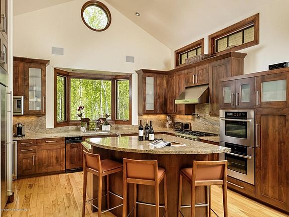 This bright and spacious home has a contemporary feel with high ceilings and a skylight enhancing the main open living area. The living room with 180 degree views from Independence Pass to Aspen Mountain has a large flat screen TV and a gas fireplace and the dining room has a parson's style table with 8 lucite chairs. Walk out to the wrap around deck overlooking a large fenced yard with an abundance of Aspen trees creating wooded privacy. The kitchen has dark wood cabinets and granite counter tops with upscale appliances, including a Viking 6 Burner stove top with pot filler, two Bosch ovens, two dishwashers, wine cooler, trash compactor, microwave and a full size refrigerator and freezer by GE Monogram.