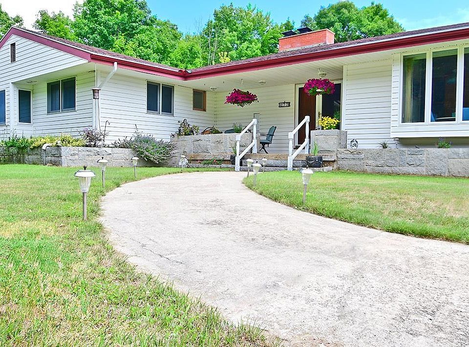 Spacious, contemporary offering with 3+ bedroom, 4 bath, 2 living spaces, 5 car garage is ready for move in! Original mid-century flair mixed with modern updates throughout, make this home a true pleasure! Bright eat-in kitchen with a picture-perfect view through the large bay window, double ovens, a plethora of cabinets & enormous pantry/laundry room. Off the dining room is an exquisite solarium to enjoy the sun in any season. Master ensuite features a private walkout veranda. Quality, built-in closets in bedrooms. Bathrooms have been recently updated. The living room boasts a floor to ceiling, white brick fireplace, walkout slider to the deck for all your entertaining and BBQ gatherings. The finished lower level includes additional sleeping space, living area with second wood burning brick fireplace & walkout slider to backyard, dry kitchen, full bath, and direct garage entry! The oversized garage is ready for 5 cars, includes a workshop area and access to level, manicured yard. Furthermore, the home contains a water filtration system, built-in sauna (not heated currently), and cabana type outbuilding in rear yard. Close proximity to Meredith Center and all the area attractions. There are so many, many features to mention and more to see when you visit. The Sellers' favorite things about this home was hanging out in the solarium, the full-size laundry room/ pantry, and that there is plenty of space for entertaining family & friends for game nights.