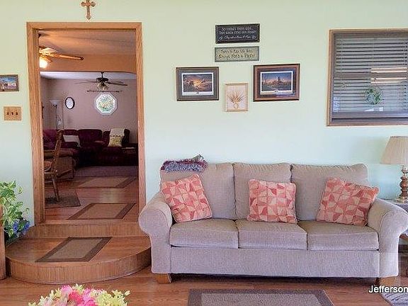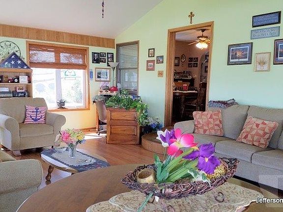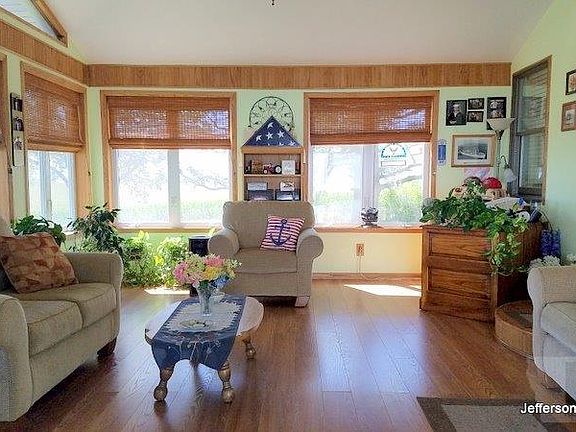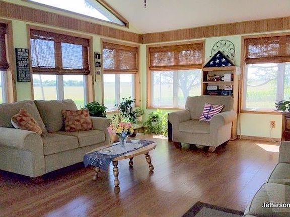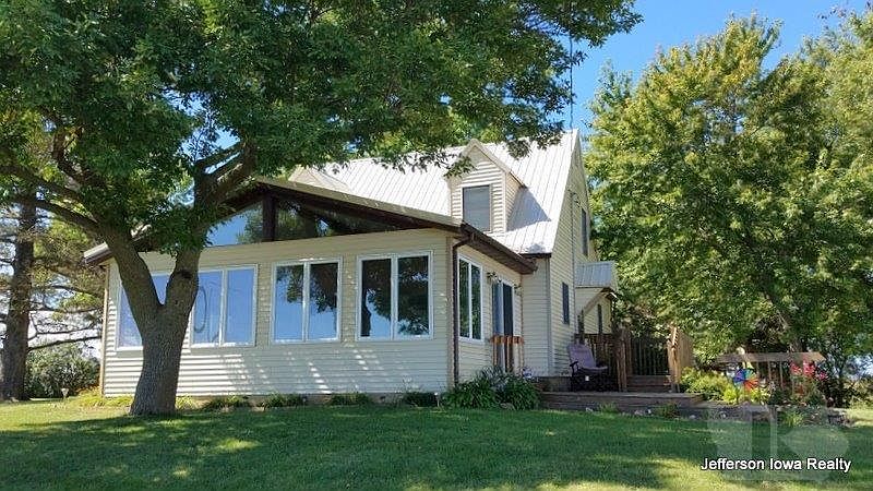 Ready for Peaceful and Quiet Country Living?? This well-maintained home is MOVE IN READY!! Main floor has living room, dining room, kitchen, bedroom, full bath with tub/shower and 16 x 24  sun room. The 2nd floor has 2 bedrooms. Stove, washer and dryer will remain. Some updates include: newer replacement windows throughout, vinyl siding, central air in 2016, and a sun room was added approx. 9 years ago. Lovely hardwood floors on most of the main. Enjoy the beautiful view overlooking the Iowa county side. This acreage has lots of mature trees and room for livestock or horses. Out buildings include a large barn with a double overhead door and electric opener, a double detached garage, and wood machine shed. Lots of storage for all your outside toys!! Seller will supply new septic system and the water softener and LP tank will remain. The remaining fuel is negotiable along with the gas generator. The driveway on the east side of the property is not included. Refrigerator is reserved.  This acreage is in southwestern Greene County.
