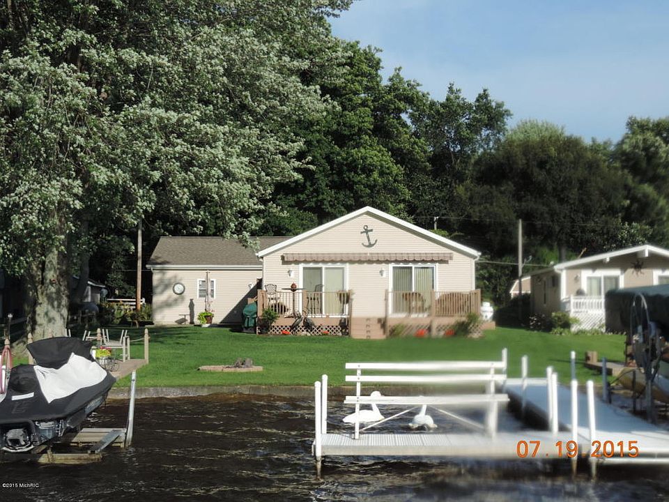 Spectacular 60'of pristine sandy lake frontage on Bartholomew Lake. Built in 2004, this 1500 sq. ft. home has three large bedrooms, including a master suite and 2 full baths. Beautiful open concept floor plan with extremely nice appliances, cabinets and countertops. The double sliding glass doors give entry to the beautiful composite deck, which is shaded by a remote control Sunsetter retractable awning. Thought it couldn't get any nicer? Consider the central air, the whole house generator, the elegant stamped concrete walkways and patio, the beautiful landscaping, the 2 car garage and the 12' x 14' shed. Includes an L-shaped docking system. Not included are 2 hanging cabinets in the garage and the free standing fireplace.