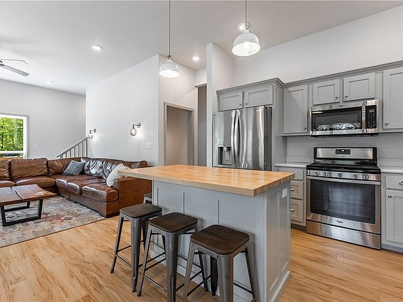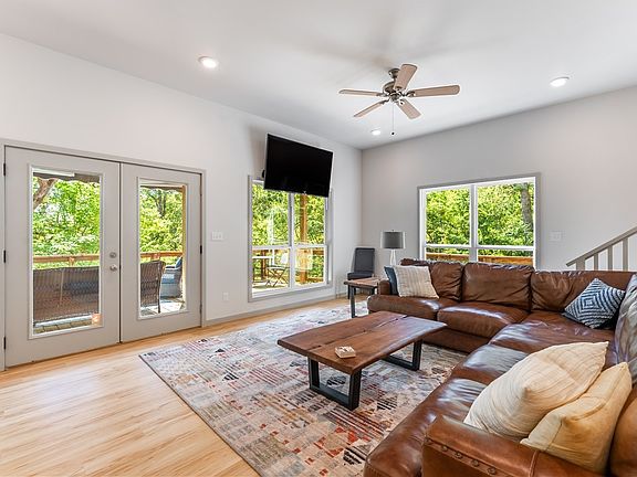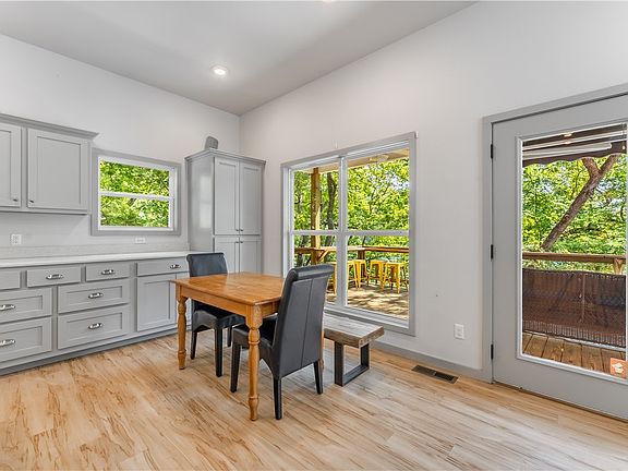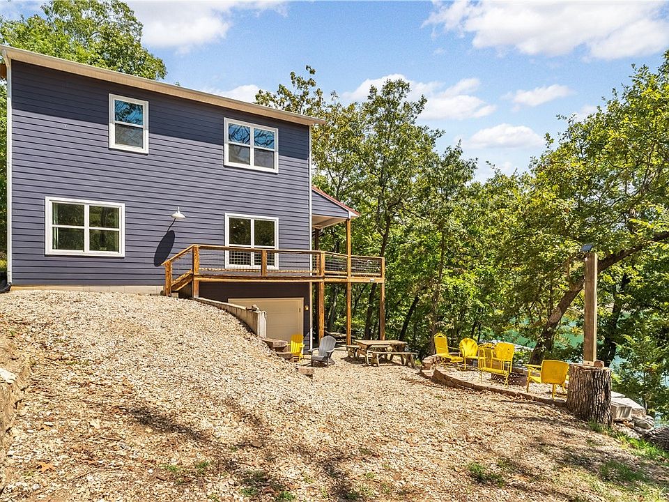 Experience the beautiful Ozark landscape on Beaver Lake with this incredible lake home! This 4-bedroom, 2-bath home offers direct access to the water, making it the perfect getaway for lake lovers. The open-concept living area and kitchen create an inviting space for gatherings, seamlessly extending to a covered deck where you can enjoy indoor-outdoor entertainment with breathtaking lake views. The upstairs features an over sized bedroom equipped with several bunk beds, providing ample space for guests. Each guest bedroom includes a private sink, adding an extra touch of convenience and comfort. Outside, a lower-level covered patio offers even more space to relax and take in the serene surroundings. Enjoy access to your shared dock with a large swim deck and two boat slips. The 450 square foot, heated, and cooled garage ensures plenty of storage for all your lake equipment. With its ideal layout and prime location, this lake home is ready to host unforgettable memories on Beaver Lake.