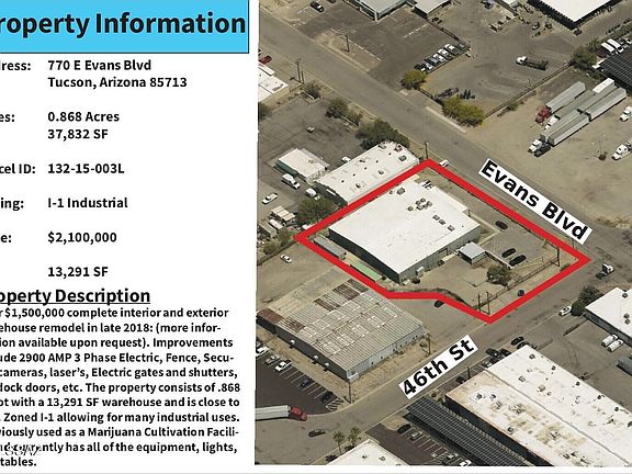 Over $1,500,000 complete interior and exterior warehouse remodel in late 2018: (more information available upon request). Improvements include 3 Phase Electric, Fence, Security cameras, laser's, Electric gates and shutters, 17' dock doors, etc. The property consists of .868 AC lot with a 13,291 SF warehouse and is close to I-10. Zoned I-1 allowing for many industrial uses. Previously used as a Marijuana Cultivation Facility and currently has all of the equipment, lights, and tables.