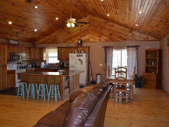 A private secluded home located only 2 miles from town. A newer 5 bedroom home with a full walkout basement. The main open living area has beautiful wood ceilings and open living, dining, kitchen area. There are washer/dryer hookup on both levels and two heating systems including a forced air furnace and outdoor wood furnace. For outdoor enjoyment you have a covered front porch, large back deck and 27 ft. above ground pool.