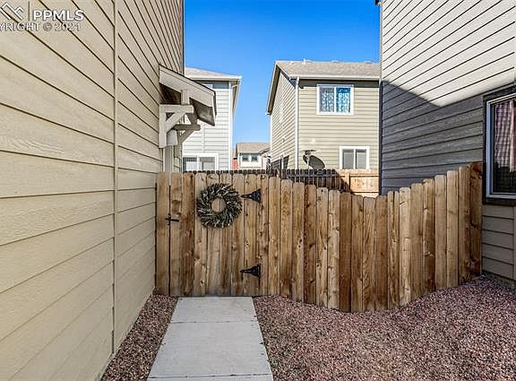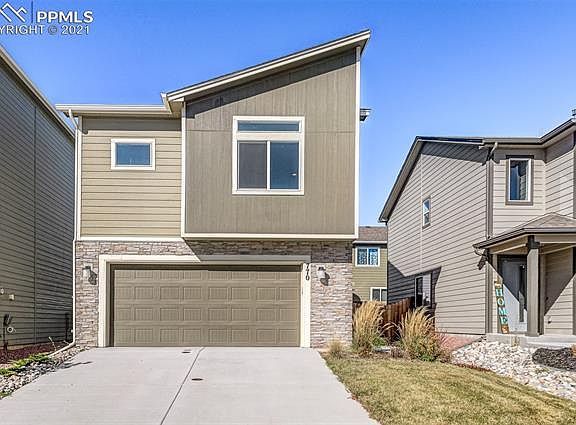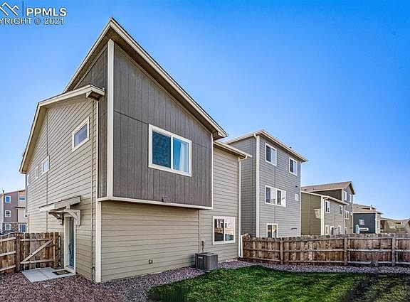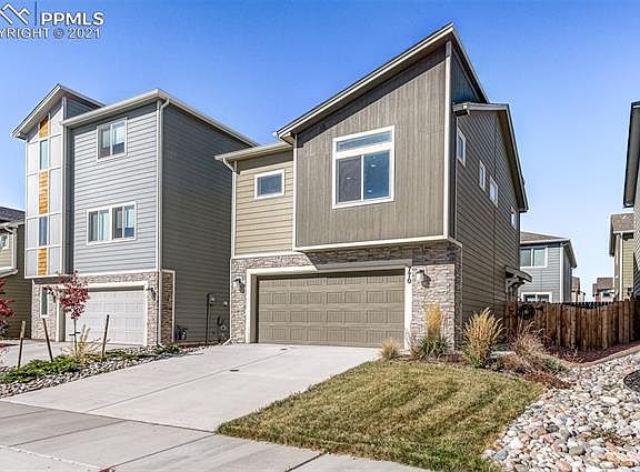 Don't miss this beautiful Challenger home built in 2019 that looks and feels like new! Featuring 2 bedrooms, 2 baths, and a 2 car garage, this home is centrally located in highly desirable Patriot Park. Enjoy easy access to Peterson Air Force Base, Ft Carson, Colorado Springs Airport, Amazon Distribution/Warehouse Complex, Shopping, Dining, and so much more! As you enter the home on the main level, through either the main door (located inside the gated yard...convenient for children, pets, and privacy) or through the 2 car garage, you'll find a large bedroom with spacious closet and attached bath with freestanding shower. On the upper level, you'll fall in love with the bright, open layout of the large family room with separate dining nook and gorgeous kitchen with additional bar seating, perfect for entertaining. The kitchen features beautiful stone counters, white cabinets, all stainless steel appliances, and an attached spacious walk-in pantry/laundry area. Also on the upper level, you'll find the spacious main bedroom, an attached full bath with a double vanity and large garden tub/shower combo, plus a generous walk-in closet. Additional features and upgrades include CENTRAL A/C, beautiful wood laminate flooring, modern neutral colors, front and rear outdoor sprinkler system (recently winterized), fenced rear yard with healthy lawn, and pre-wiring/switches for ceiling fans. Additonally, there is a neighborhood park with walking trails and breathtaking mountain views, plus optional amenities (pool and fitness center) available for purchase next-door at The Retreat at Patriot Park. Hurry, you've just found your new home!