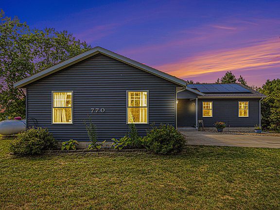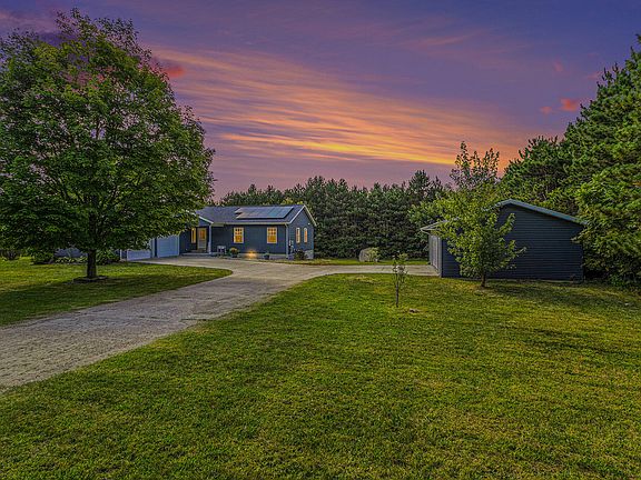 2,002 finished sq. ft. walkout ranch in a private country setting on 3.3 acres. This great home features an attached 2 car garage with vehicle charging station as well as an additional detached 2 car garage for extra storage. Everything you need is on the main floor including the owner's suite with a private bathroom and jetted tub. Also on the main floor is a dedicated laundry room, 2 additional bedrooms and another full bathroom. The beautiful kitchen includes granite counters, stainless steel appliances, a center island snack bar and tons of cabinet space, as well as 2 large pantries. The kitchen, living room and dinning area are all open to each other with a vaulted ceiling and lovely wood floors. Off of the kitchen is a composite deck with great views of the spacious, wooded yard and garden area. The full walkout basement features 2 spacious finished rooms and is plumbed for a 3rd bathroom. The remaining basement area is a great rec room/ entertainment area as well as ample storage space. Enjoy watching beautiful sunsets over the open fields in your back yard and making s'mores around the fire in your private bonfire pit/camping area with two seasons worth of hardwood chopped and stacked. This home is also equipped with $40k worth of solar panels and an electric car charging station in the garage.