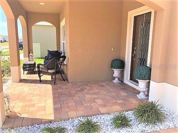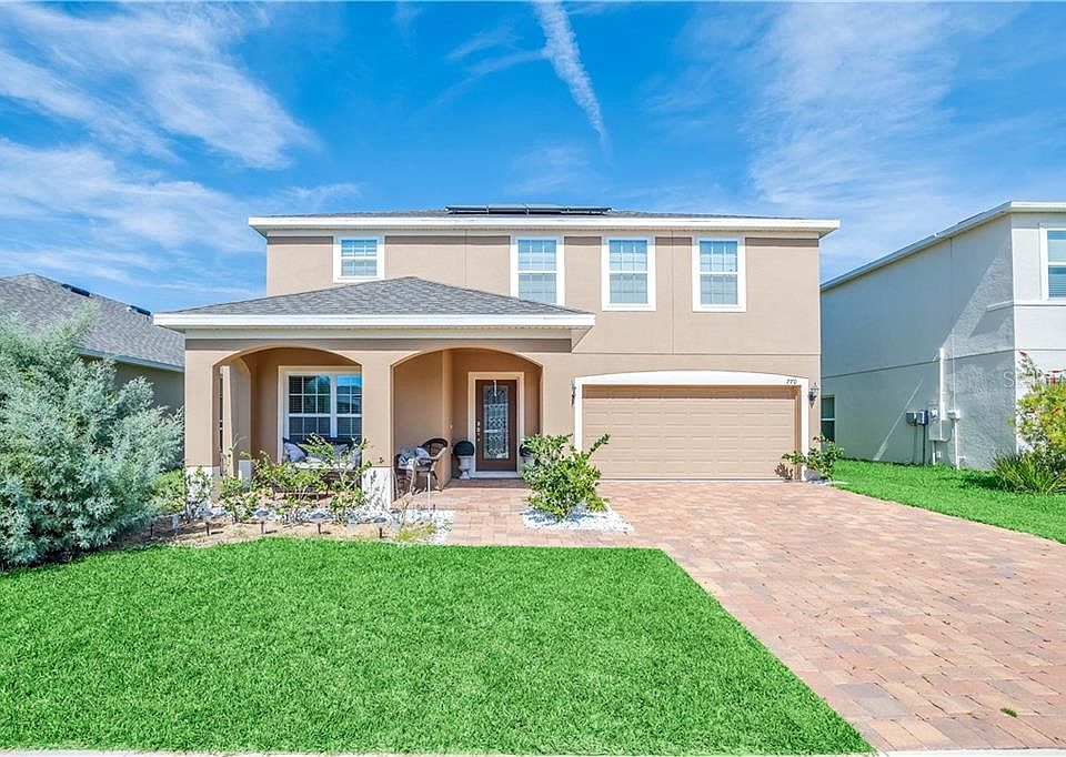 Come and see this stunning NEW LISTING. LOW HOA, NO CDD, NO REAR NEIGHBORS. Beautiful & immaculate, your new home features 5 Bedroom, 3 full bathrooms. Beautiful pavers in driveway, with carriage lights, elegant beveled glass front entry door, as you enter, you are welcomed into the formal living and dining areas. Continuing through the doorway, the home opens up to a gourmet kitchen with 42" espresso cabinets with crown molding, granite counter tops and STAINLESS STEEL APPLIANCES, nook and adjoining family room, overlooking the covered lanai. Convenient first floor bedroom and full bathroom with shower stall. The staircase lead you to a stunning size loft/ flex room with a closet, this spacious area may be used for a variety of purposes, such as a bonus room, a media room or an office. The Master Suite is very private and includes ample space for a sitting or exercise area. Master bath includes Dual Sinks, Jacuzzi Bath Tub with Separate Shower Stall. Leased Solar Panel system makes this house especially attractive due to its low and efficient energy consumption. Prime location just minutes from I-4 for a quick trip to all the Orlando theme parks, Champions Gate, Northeast Regional Park, beaches, shopping, and dining! The community offers a lovely pool and playground area.